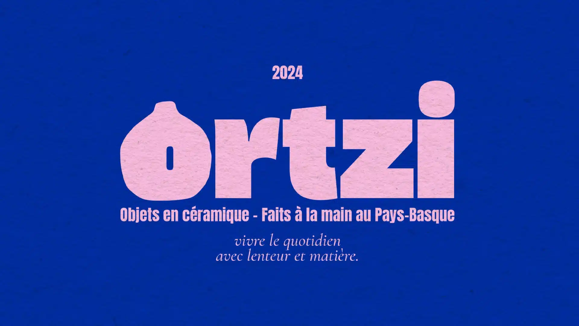 Ortzi – Identité visuelle pour céramiste créée par le studio Rhoedaé, rose sur fond bleu, style brut et contemporain.